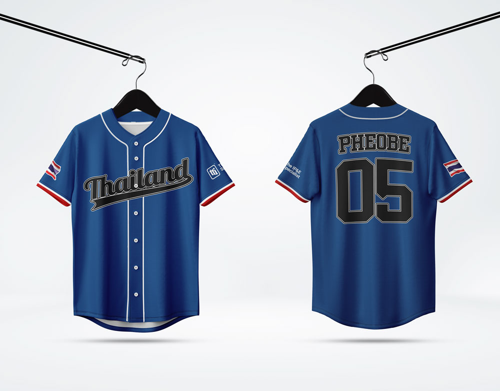 เสื้อเบสบอลสีน้ำเงินแบบคลาสสิก พิมพ์ลาย Thailand ด้านหน้าและชื่อผู้เล่น PHEOBE หมายเลข 05 ด้านหลัง