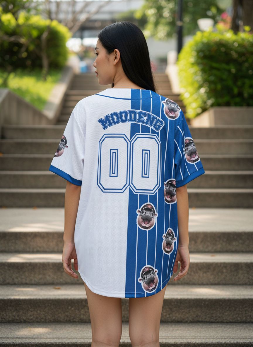 เสื้อเบสบอลสไตล์วินเทจลายหน้าหมูเด้ง สีขาวน้ำเงินลายทาง พร้อมกระดุมหน้าและหมายเลข 00