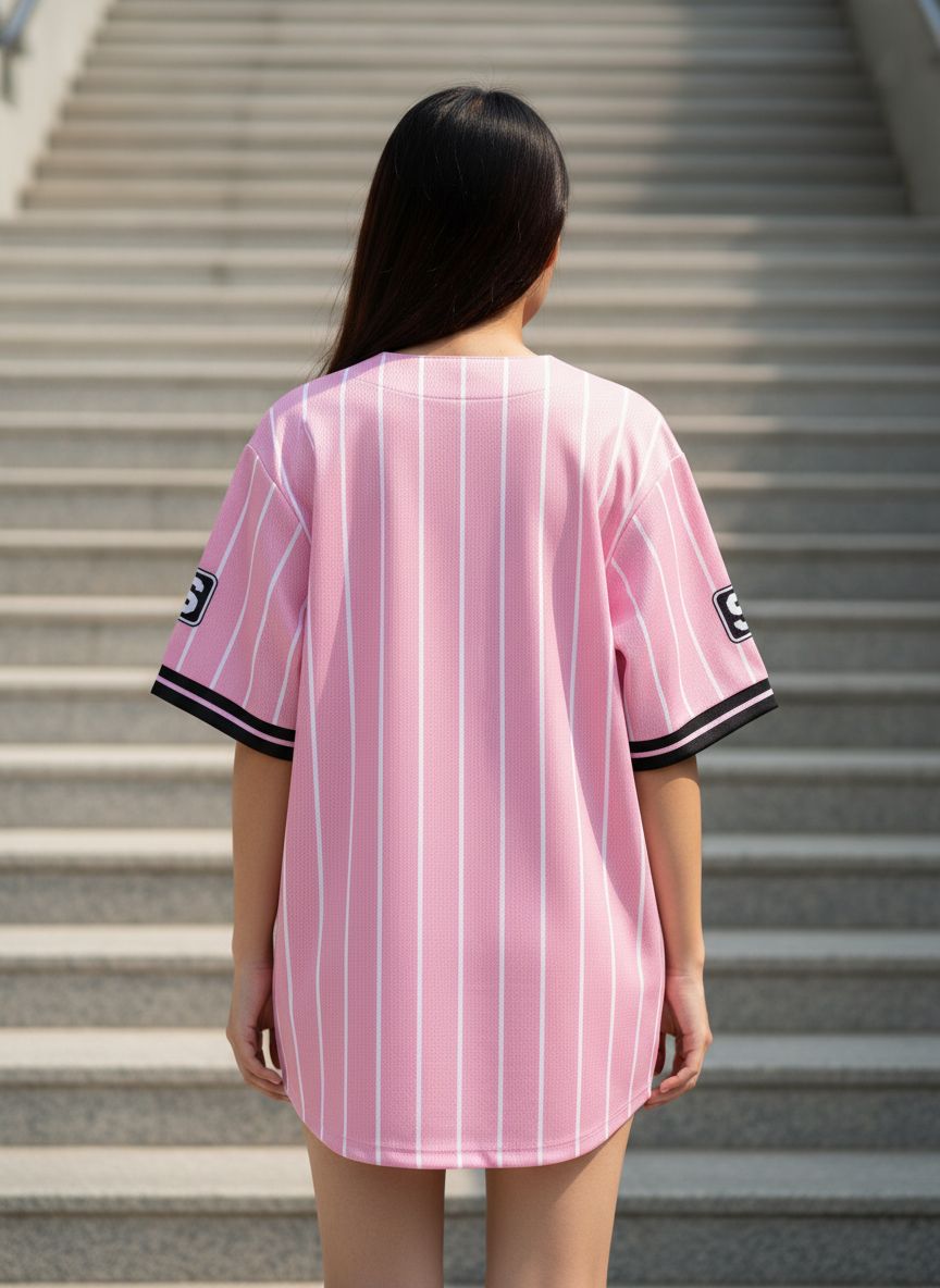 เสื้อเบสบอลสีชมพูลายทางแนวสตรีท พร้อมดีไซน์โลโก้ 77 Club และข้อความ Girl Boss สุดเท่ห์