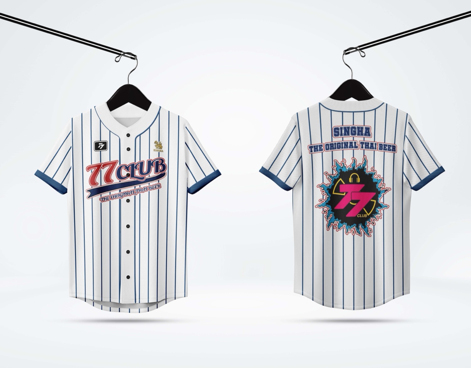 เสื้อเบสบอลสีขาวลายทางสีน้ำเงิน ด้านหน้าพิมพ์โลโก้ 77 CLUB ด้านหลังตกแต่งด้วยโลโก้ลูกไฟและข้อความ SINCHA