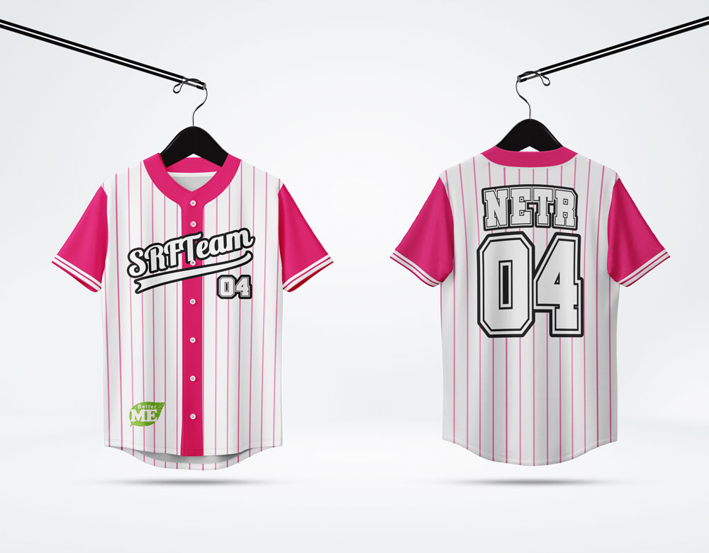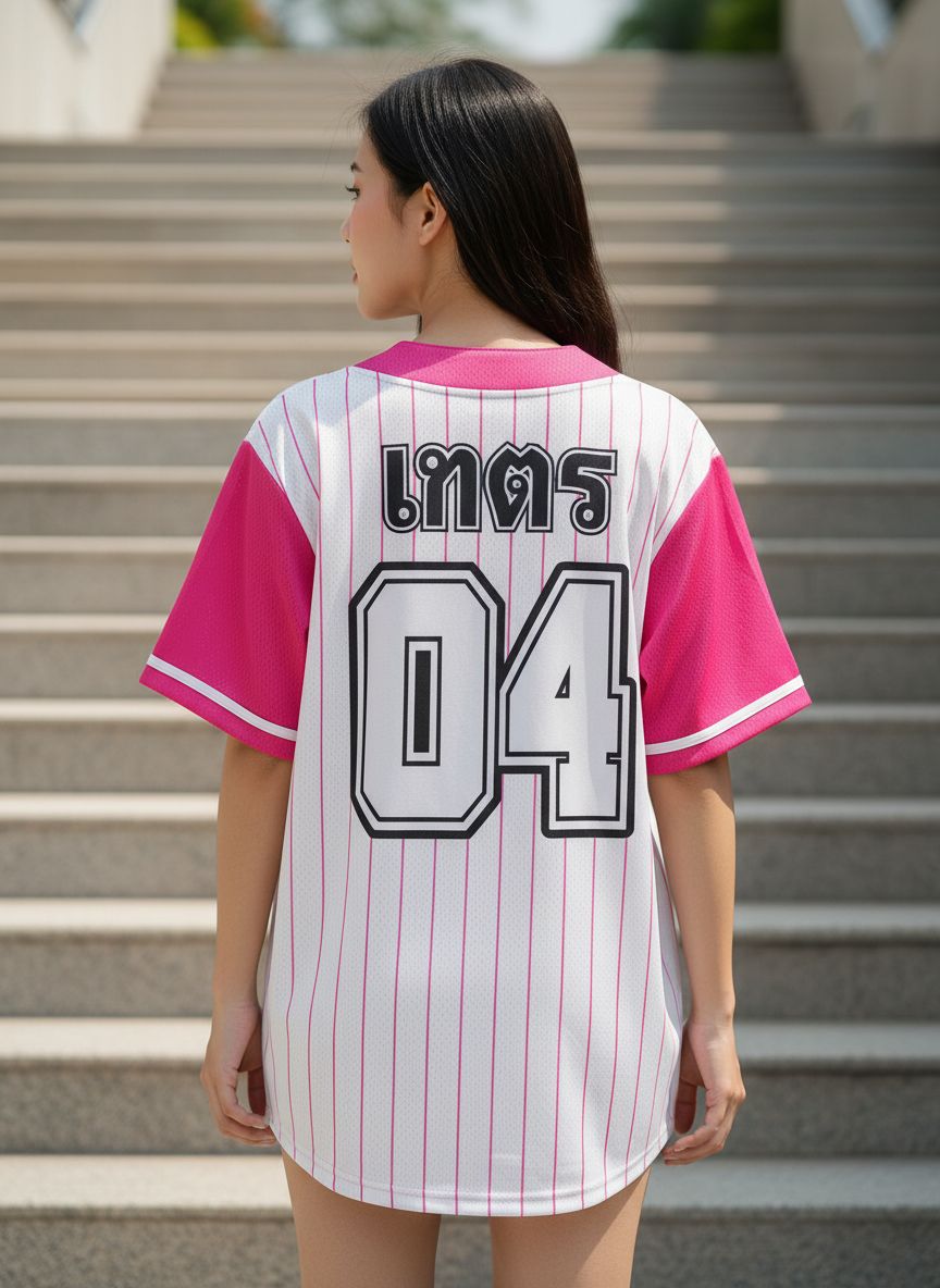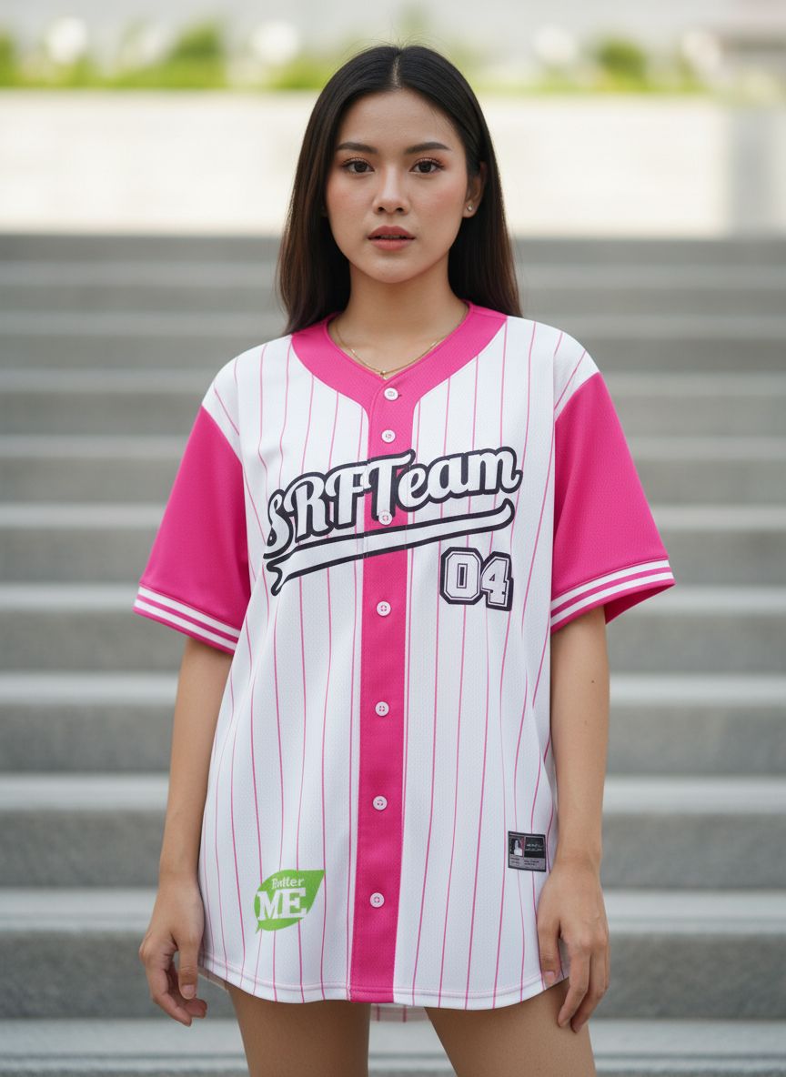 เสื้อเบสบอลสไตล์คลาสสิกลายทางสีชมพู พร้อมโลโก้ SRH Team และเบอร์ 04 ดีไซน์สปอร์ตเท่ห์