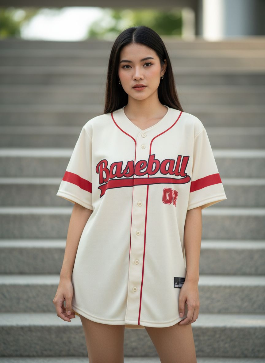 เสื้อเบสบอลสไตล์วินเทจสีครีมตัดขอบแดง พร้อมลายปัก Baseball และหมายเลข 22